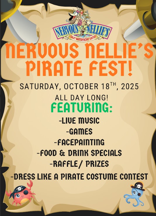 Guests are encouraged to dress like pirates for the pirate costume contest with prizes given out later in the evening. There will also be raffles for nervous Nellie’s gift cards and a huge gift basket with over $250 value being the grand prize.