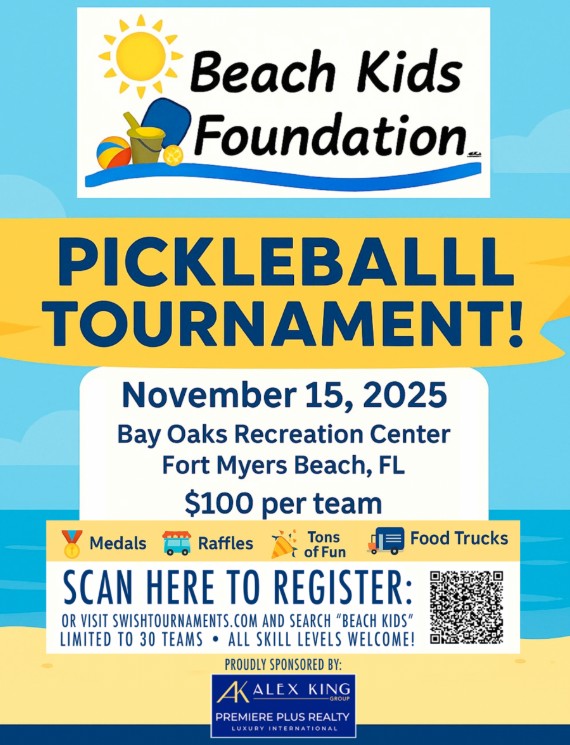 The Beach Kids Foundation is hosting a Pickleball Tournament at Bay Oaks Saturday November 15th. Teams can register for $100 with the proceeds benefitting the Foundation. The Alex King Foundation is sponsoring the tournament. Get all the details and register HERE.
