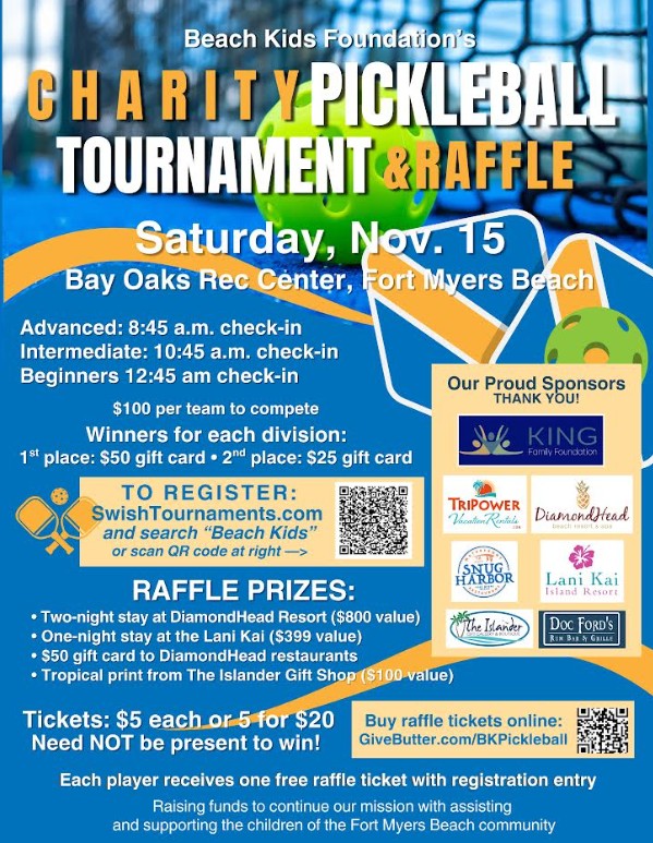 The Fort Myers Beach Kids Foundation is hosting a pickleball tournament being held at Bay Oaks on Saturday, November 15th. There will be giveaways that you can register for without even attending the event.