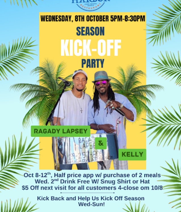 Headlines Snug Harbor Hosting Season Kick-Off Party October 6, 2025 0 18 FacebookTwitter And it all kicks off Wednesday at 5PM with musical artists Ragady Lapsey & Kelly. Snug Harbor, located on the water next to Bayside Park on Old San Carlos, is running season kick-off specials Wednesday through Sunday.