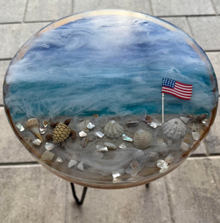 Handcrafted Coastal Patriotic TableA stunning 12” x 19” round wood table featuring a hand-painted ocean scene with real Fort Myers Beach sand and shells. One side highlights a sea turtle, the other an American flag — all sealed in glossy epoxy resin for a coastal-meets-patriotic masterpiece. $100 value